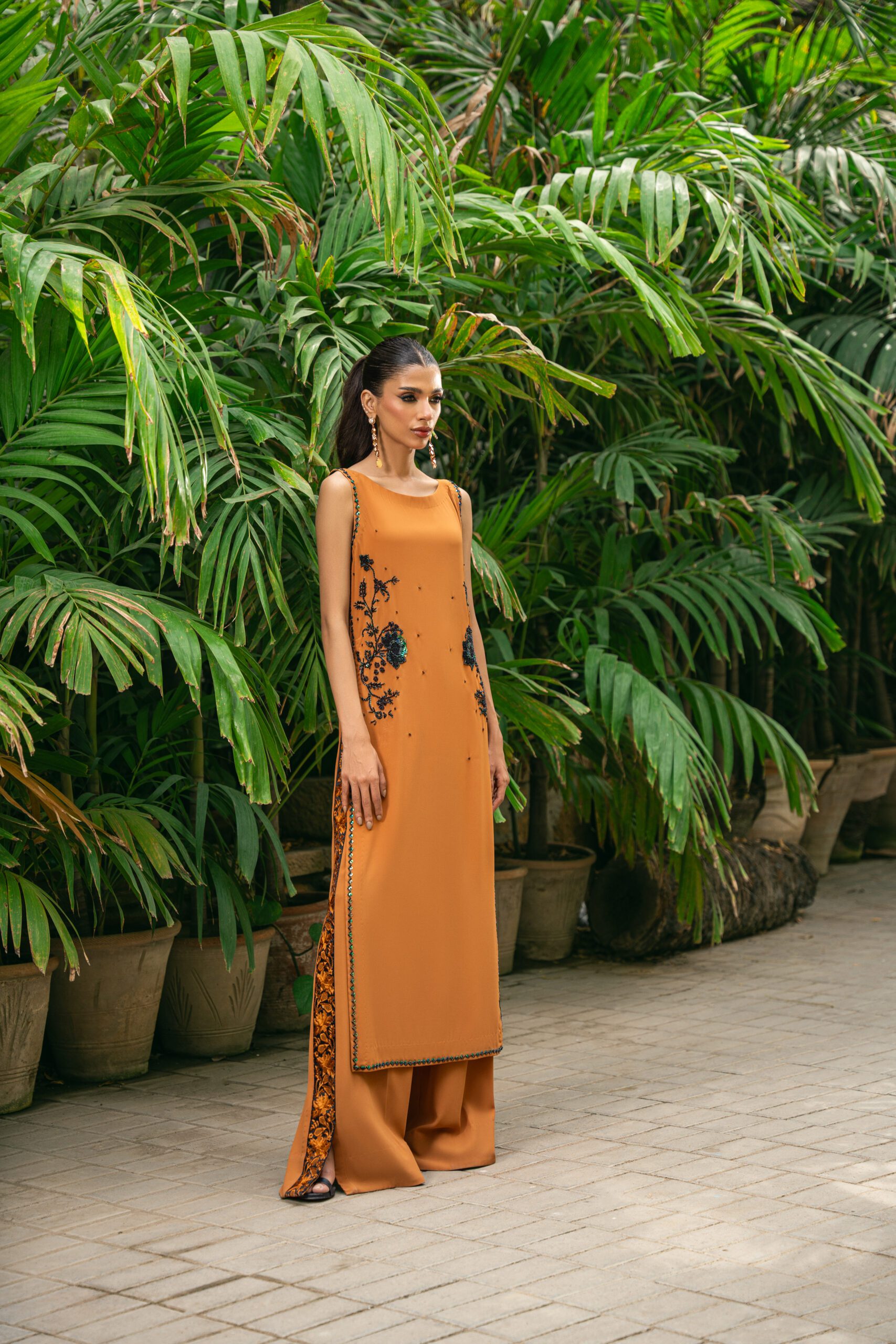 Additional Description:Â Meena is a four piece stitched long shirt paired with plazo pants adorned with beautiful multi coloured embroidery.